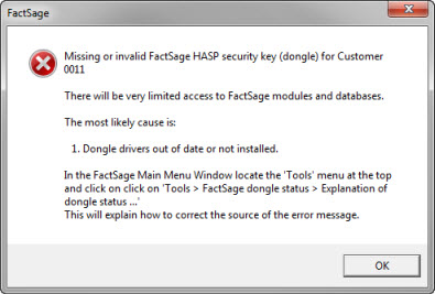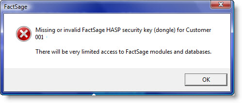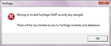 If FactSage issues an error message about a 'missing or invalid FactSage HASP security key'