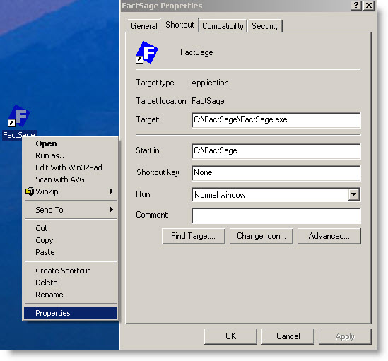 Mouse-right-click on the FactSage shortcut to list the properties.