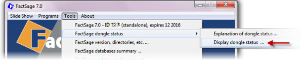 (FactSage Menu > 'Tools > FactSage dongle status > Explanation of dongle status ...' )