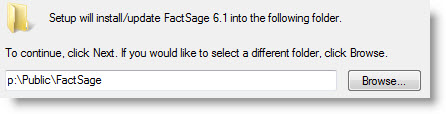 Where should FactSage be installed? Enter the name of the public 'share read-only' directory where FactSage is to be installed. The directory must reside on a fixed hard disk. FactSage server installations are not supported on virtual machines. You can use a long file name with up to 64 characters including spaces. We strongly recommend you use the sub-folder name FactSage - for example: