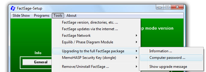To activate the full FactSage package you need a server computer password which you obtain from us.